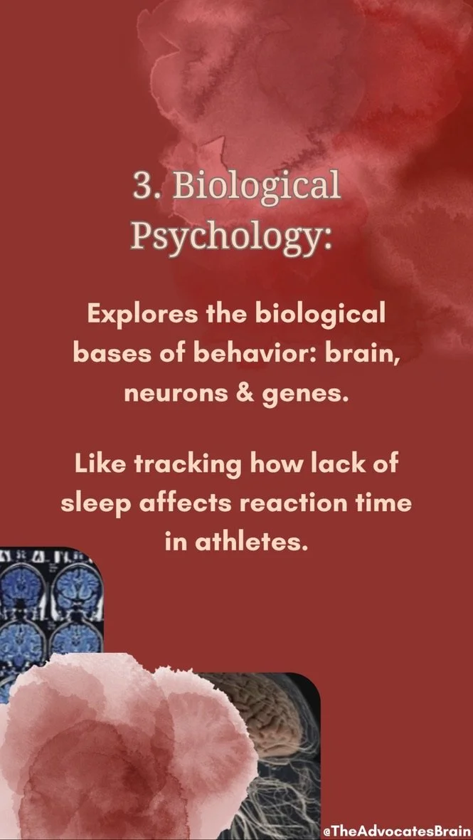 Biological psychology explores the connection between biology (like your brain and nervous system) and behavior.